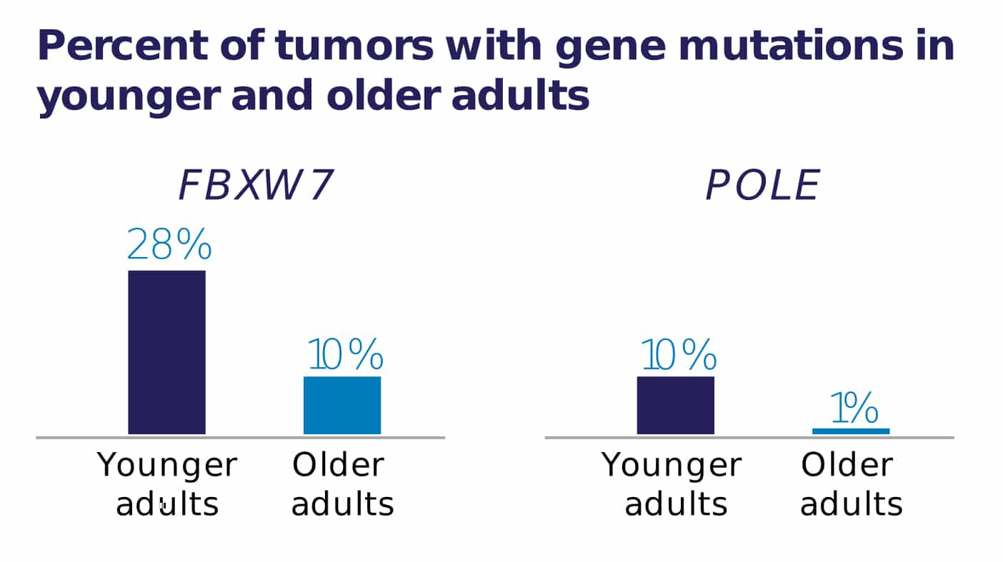 Researchers found mutations (changes) happened more often in 2 genes in the tumors of young adults than in older adults.